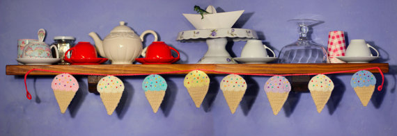 These crocheted ice cream cones are so cute. And I love the idea of having them in the kitchen. One awesome thing about homemade Etsy items is a lot of the time the seller will let the customer pick their own colors. I think that would be a sweet way of making this garland your very own.