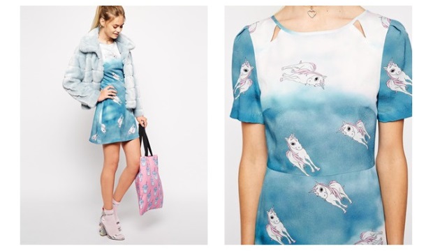 I’ve had my eye on this one for a while now. I just can’t get over how cute the unicorns are with their pink manes and long eyelashes. And I love how the blue and white in the dress makes me think of a cloudy sky.