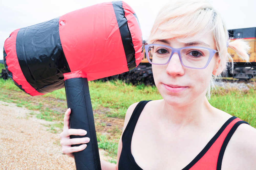 costume dress – Hot Topic (similar) | leggings – Hot Topic | boots – old | mallet – Hot Topic